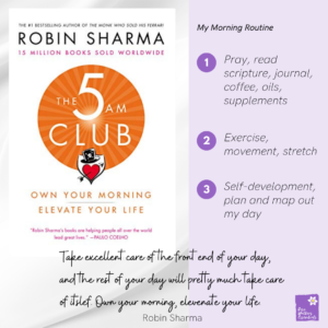 One of my favorite books that I’ve read (at least 5 times!) on setting a morning routine is “The 5 AM Club” by Robin Sharma. It was indeed pivotal for me! It helped me create a backbone to that precious time in the morning that I focus on only me.